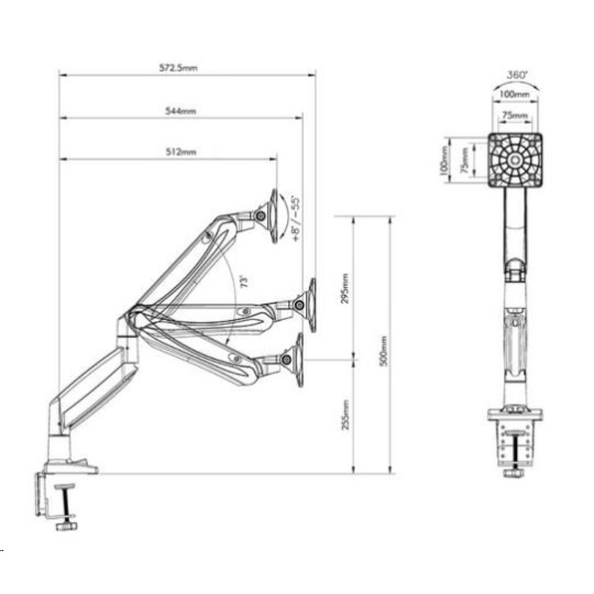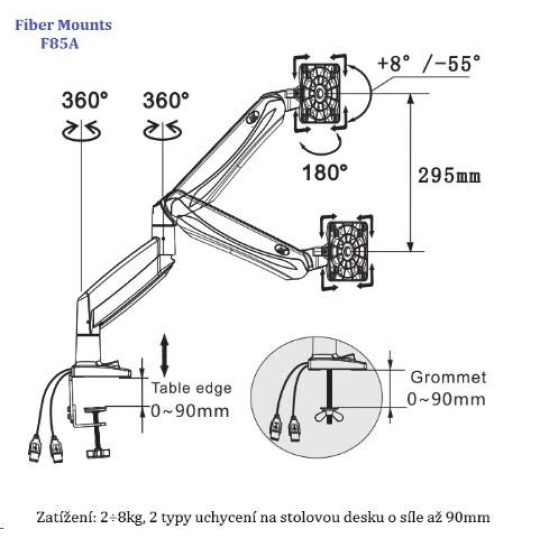 Profesionálny kancelársky držiak LCD monitoru Fiber Mounts F85A Kancelársky držiak na PC monitory 19÷32", nastavenie výšky, otáčanie, náklon, rotácia, korekcia roviny, 2 typy uchytenia na stolovú dosku, USB konektory, systém vedenia kábláže Profesionálny stolový držiak na uchytenie a polohovanie PC LCD monitorov s uhlopriečkou 19 až 32 palcov. Držiak vám umožní 3D polohovanie obrazovky monitora: otáčanie do strán, náklon, nastavenie vzdialenosti od stolového uchytenia, výšková polohovateľnosť, rotácia monitora. Držiak je osadený USB konektormi a má systém pre vedenie kábláže. V balení nájdete 2 typy uchytenia na stolovú dosku o priemere až 90mm: na okraj stolu alebo do priestoru stolu. Držiak podporuje VESA štandardy 75x75 a 100x100, v prípade potreby je možné dokúpiť rozšírenie na 200x100 alebo aj 200x200. Zavesiť môžete všetky monitory a televízory s hmotnosťou 2 až 8kg. Výšková polohovateľnosť je zabezpečená plynovým piestom s nastaviteľnou tuhosťou - jednoduchá regulácia. Profesionálna kvalita a krásny dizajn držiaku Fiber Mounts F85A umožní použitie v firmách, kanceláriách, pracovniach, ale aj domácnostiach a detských izbách. Technické údaje: zaťaženie 2÷8kg podporuje VESA štandardy 75x75 a 100x100 možnosť rozšírenia VESA na 200x100 alebo 200x200 odporúčame na monitory a televízory s uhlopriečkou 19 až 32" otáčanie do strán +/-90° náklon: nahor +55°, nadol -8° celková výška 500mm výšková polohovateľnosť v rozmedzí 295mm maximálna vzdialenosť od stolového uchytenia 572mm funkcia PIVOT - rotácia monitora, nastavenie horizontálnej alebo vertikálnej polohy monitora korekcia roviny monitora integrované USB konektory súčasťou balenia 2 typy uchytenia na stolovú dosku: na okraj stolu alebo do priestoru profesionálna kvalita ľahká nastaviteľnosť krásny dizajn záruka 2 roky Kancelársky držiak na LCD monitory Fiber Mounts F85A podporuje VESA štandardy: VESA 75x75 VESA 100x100 možnosť dokúpiť rozšírenie VESA 200x100 možnosť dokúpiť rozšírenie VESA 200x200