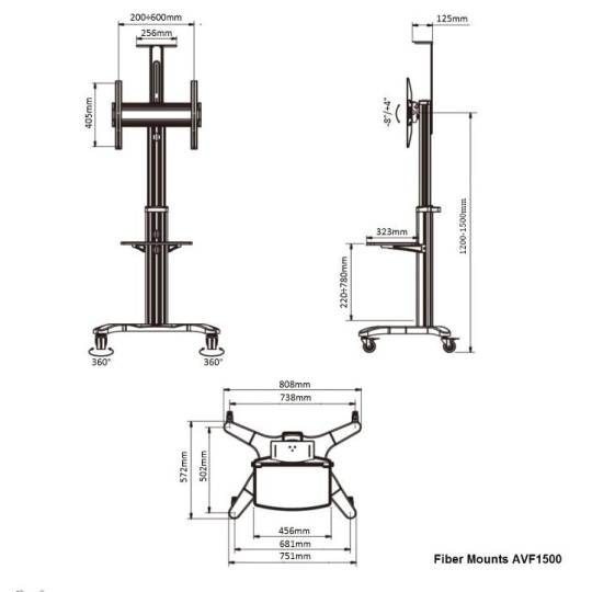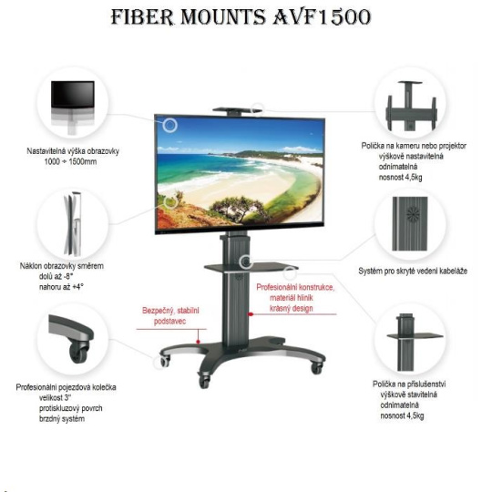 Technické údaje: •maximálne zaťaženie 36,4kg •podporuje VESA štandardy 200x100 až 600x400 •na TV 32" až 60" •min. výška stojanu 1200mm •max. výška stojanu 1500mm • náklon obrazovky +4° až -8° •polica na príslušenstvo - súčasť balenia •polica na kameru - súčasť balenia •profesionálna konštrukcia - top kvalita •pojazdové kolieska s brzdou •dokonale stabilný •materiál hliník •farebné prevedenie čierne •záruka 5 rokov Televízny stojan AVF1500 podporuje VESA štandardy: •VESA 200x100 •VESA 200x200 •VESA 300x200 •VESA 300x300 •VESA 400x200 •VESA 400x300 •VESA 400x400 •VESA 600x400