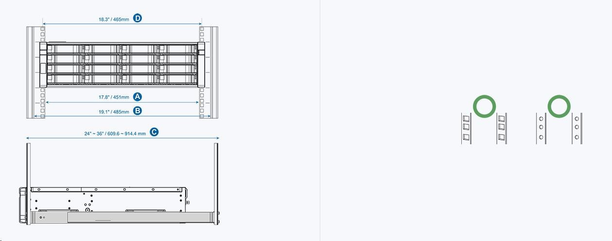 - Vzdialenosť medzi dvoma rackovými stĺpmi (meranie štvorcových otvorov racku stred-stred) je 18,3"(465 mm)