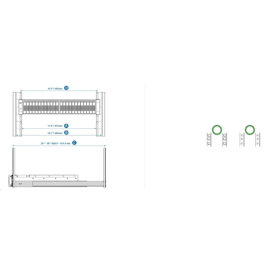 Sady kolejníc QNAP Rail Kits pomáhajú pri inštalácii QNAP NAS do racku. Posuvné kolejnice umožňujú zasunutie QNAP NAS dovnútra a vysunutie von pre ľahkú údržbu a správu. Modely QNAP NAS určené do racku vyhovujú štandardom rackovej montáže ANSI/EIA-RS-310-D. Než nakúpite serverový rack, najprv sa prosím uistite, či tento serverový rack zodpovedá príslušným špecifikáciám.