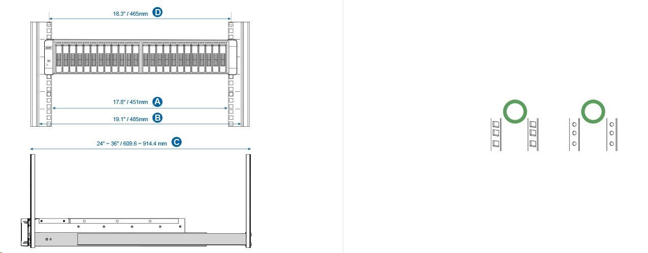 - Vzdialenosť medzi dvoma rackovými stĺpmi (meranie štvorcových otvorov racku stred-stred) je 18,3"(465 mm)