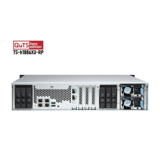 Zarízení TS-h1886XU-RP R2 2U s montážou do racku má dvanásť 3,5" diskových pozícií SATA 6Gb/s, šesť 2,5" slotov SATA 6Gb/s SSD, podporuje konektivitu 10GbE a štyri 2,5GbE a je vybavené štvorjadrovým procesorom Intel® Xeon® D-1622 s pamäťou až 128 GB DDR4 ECC (Error Correcting Code). S operačným systémom QuTS hero na báze ZFS dosahuje TS-h1886XU-RP R2 výkon serverovej triedy a vysokú spoľahlivosť. Či už ide o súborové servery s kritickým významom, virtualizačné servery, kolaboratívne úpravy videí alebo efektívne aplikácie na zálohovanie a obnovu dát, zariadenie TS-h1886XU-RP R2 s trojročnou zárukou ponúka vysoko výkonné a zároveň cenovo výhodné riešenie NAS.