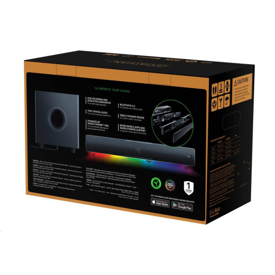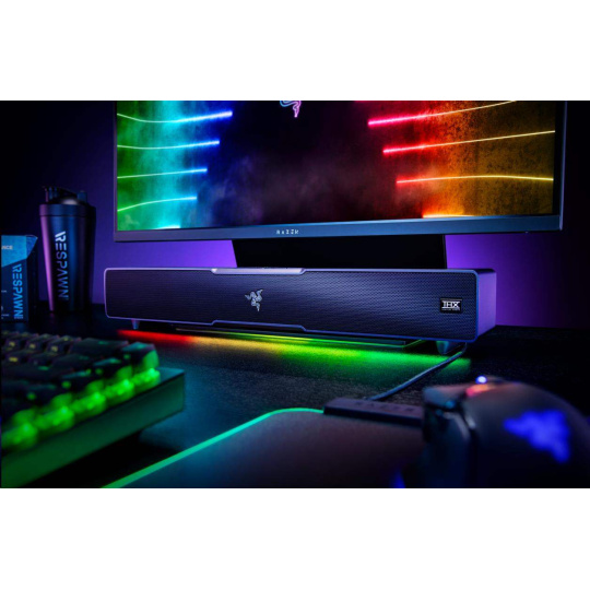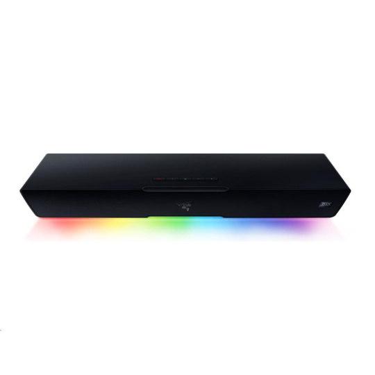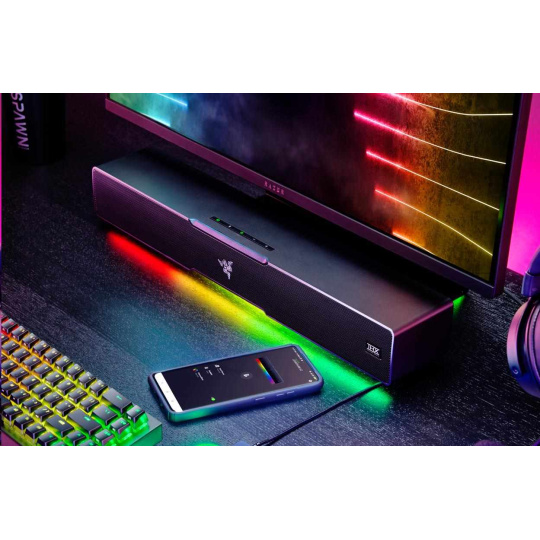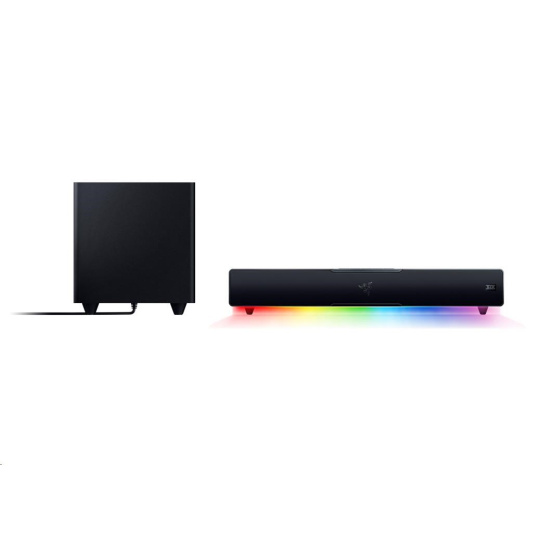 | OTHERS | Razer Chroma™ RGB (18 zones) THX Spatial Audio (PC based via Synapse 3) Bluetooth 5.2 (60ms low latency) USB audio input Razer Audio app Razer Chroma RGB app Custom 10-band EQ Raised feet on soundbar Headphone quick toggle Dimensions: Soundbar: 19.7 x 3.6 x 3.3" / 500 x 91.3 x 84 mm Subwoofer: 8.67 x 8.67 x 9.5" / 220 x 220 x 241.5 mm |