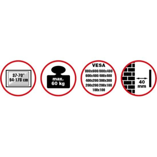 Cenovo výhodný nástenný oceľový držiak SLIM s minimálnou vzdialenosťou od steny na Plasma a LCD TV s uhlopriečkou 37"- 70" (94-178cm) a hmotnosťou maximálne 60kg. Bez konzoly (len úchyty) na zavesenie TV s upevnenými držiakmi - protikusy, dolné distančné prvky. Nie je vertikálne výklopný, vzdialenosť od steny 40mm, materiál oceľ, farba čierna. Uchytenie VESA: 100x100, 100x200, 200x200, 400x200, 400x400, 600x400, 600x600, 800x600.