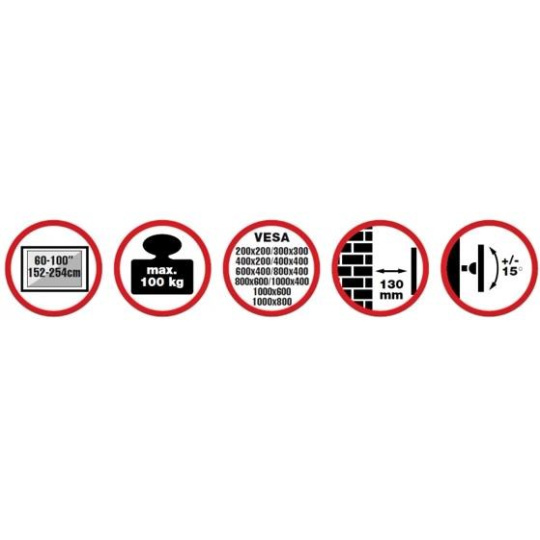 Nástenný oceľový držiak na Plasma a LCD TV s uhlopriečkou 60"-100" (152-254cm) a hmotnosťou maximálne 100kg. Konzola na zavešenie TV s vodováhou, vertikálne výklopný +15°/-15°, vzdialenosť od steny 130mm, materiál oceľ, Click-in systém, farba čierna. Uchytenie VESA: 200x200, 400x200, 300x300, 400x400, 600x400, 1000x400, 1000x600, 1000x800.