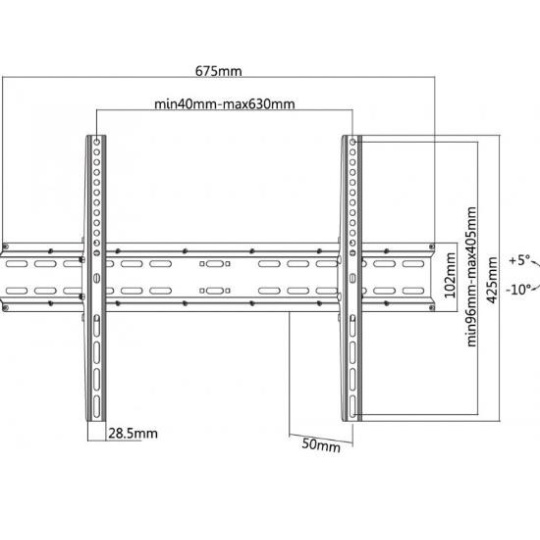 Nástenný oceľový držiak SLIM s minimálnou vzdialenosťou od steny na Plasma a LCD TV s uhlopriečkou 37"- 70" (94-178cm) a hmotnosťou maximálne 35kg. Stredová konzola na zavesenie TV s upevnenými držiakmi, vertikálne výklopný +5°/-10°, vzdialenosť od steny 50mm, materiál oceľ, farba čierna. Upevnenie VESA: 200x200, 300x200, 300x300, 400x200, 400x300, 400x400, 600x400.