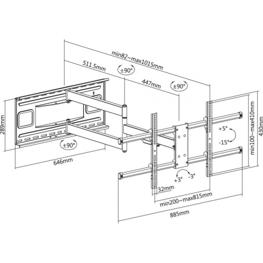 Nástenný oceľový XL držák s bočným natočením na LCD TV s uhlopriečkou 43"- 80" (109-203cm) a hmotnosťou maximálne 50kg. 3x pánt, vertikálne výklopný +5°/-15° a horizontálne otočný +90°/-90°, vzdialenosť od steny 82-1015mm, vodováha, Cable Managment, materiál oceľ, farba čierna. Uchytenie VESA: 200x200, 300x200, 400x200, 300x300, 400x300, 400x400, 600x400, 800x400.