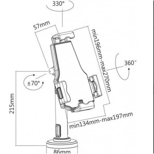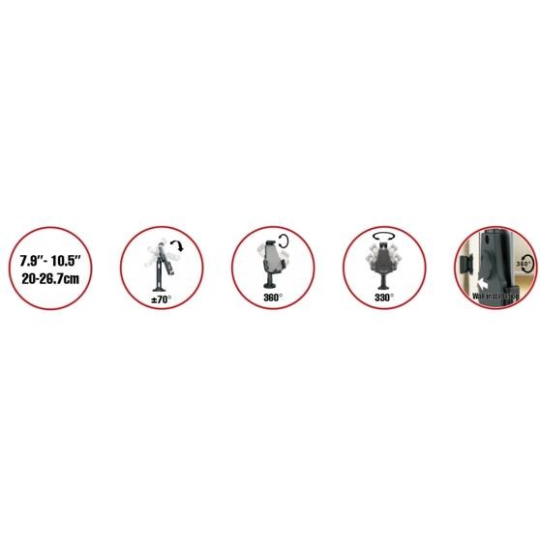 Bezpečnostné uchytenie pre 7,9-10,5" tablety na stôl a stenu. Nastaviteľný rozsah sklonu tabletu +70/-70° plus otočenie o 360°, skrutkové upevnenie na stôl - otočenie okolo osi o 330°, hmoždinky do steny, oceľové lanko proti krádeži, priechodka na kábel, čierna farba...