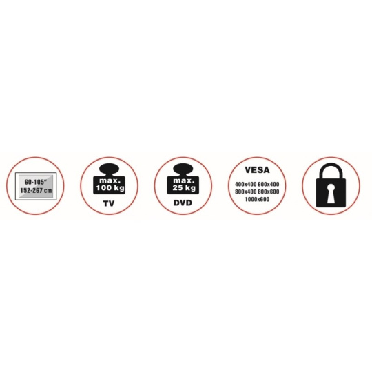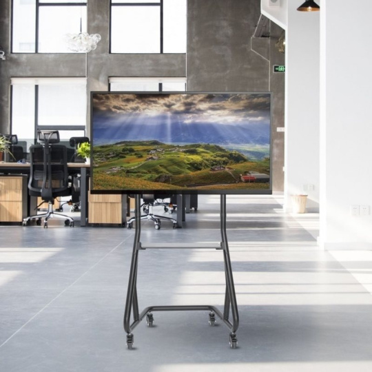 Televízny stolík na veľké TV s uhlopriečkou 60" - 105" (152-267cm) a hmotnosťou maximálne 100kg. Trubkový nosný profil 168,5cm na kolieskach s aretáciou, fixný držiak s možnosťou zamknutia, police 28x33cm max 25kg, Cable managment, rozmery 109x68x168,5cm, materiál hliník/ocel, farba čierna. Uchytenie VESA: 400x400, 600x400, 800x400, 800x600, 1000x600.