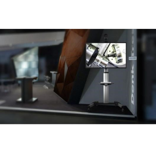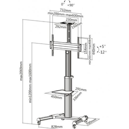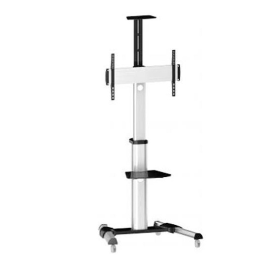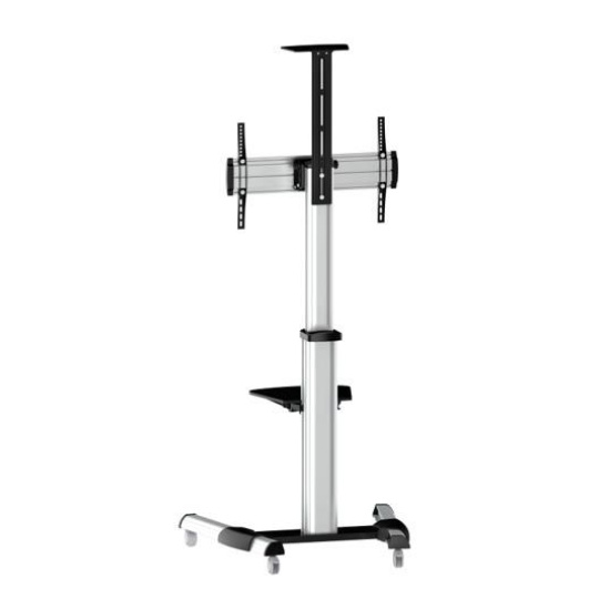 Moderný televízny stolík na Plasma a LCD TV s uhlopriečkou 37"- 70" (94-178cm) a hmotnosťou maximálne 50kg. Stredová teleskopická nosná tyč na kolieskach, držiak otočný o 90° a vertikálne výklopný +5°/-12°, horná výškovo nastaviteľná plocha pre kameru, polička, AluDesign, farba strieborná. Uchytenie VESA: 200x200, 300x300, 400x200, 400x400, 600x400.