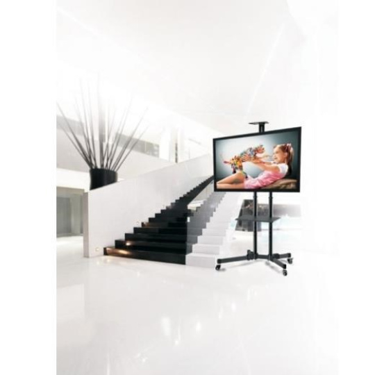 Televízny stolík na Plasma a LCD TV s uhlopriečkou 37"- 70" (94-178cm) a hmotnosťou maximálne 50kg. 2x stredová nosná tyč na kolieskach, držiak vertikálne výklopný +10°/-10°, horná výškovo nastaviteľná plocha pre kameru, polička, materiál oceľ, farba čierna. Uchytenie VESA: 200x200, 300x300, 400x200, 400x400, 600x400.