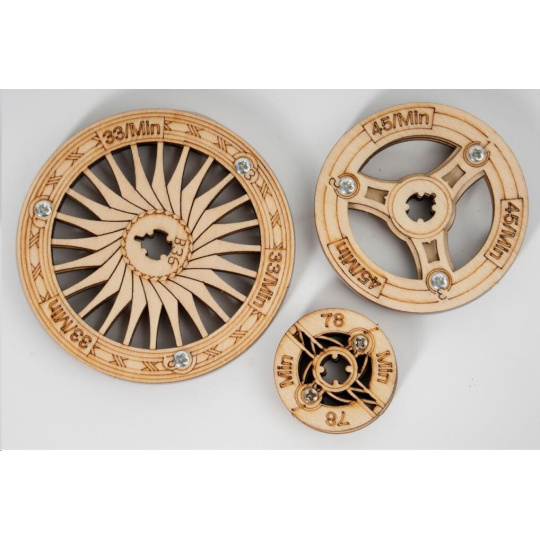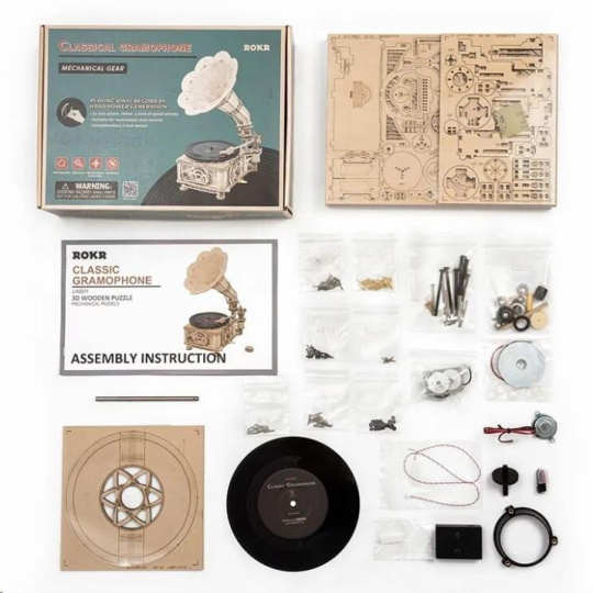 Aká je história? Stavebnica gramofónu z preglejky. Retro dizajnom, inšpirovaným gramofónom vynaloženým Thomasom Edisonem, Vás prenesie do 19. storočia. Nie je to len model, skutočne vie prehrávať platne a je k nemu tiež dodávaná 7" gramodeska obsahujúca trojicu piesní (The Merry Gent, Memory Of A Dance, The Giant Killers). zariadenie disponuje ručným, klikou, poháňaným mechanizmom a dynamom. Je možné ho však poháňať aj elektricky, pomocou vestaveného micro-USB konektora. Podporuje platne o rozmeroch 17,5 cm (7") a 25 cm (10") a všetky im zodpovedajúce rýchlosti prehrávania. Hlasitosť reprodukcie je možné upraviť pomocou otáčacieho ovládača. Jedinečný darček pre všetkých nadšencov kutilstva a hudby, ale aj luxusná interiérová dekorácia do izby či kancelárie. Skladačka je dodávaná v nesloženom stave, balená v krabici. Vybavená podrobným návodom na zostavenie.