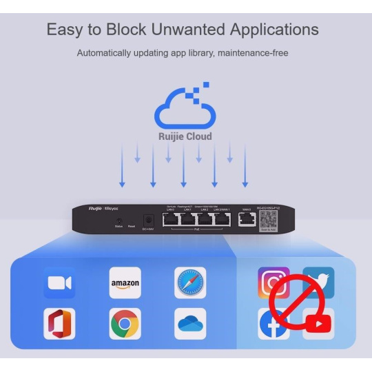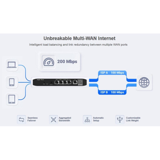 Popis produktu Ruijie RG-EG105G V2 je kabelový Gigabitový router s VPN vhodný do domácností i malých firem. Bezpečný a spolehlivý router s vlastním webovým managementem, možností správy přes Ruijie Cloud odkudkoliv a kdykoliv ale také blokováním obsahu na základě typu služeb z automaticky updatovaného seznamu nebo URL, inteligentní Multi-WAN load balancing a captive portál. Router disponuje 2 Gigabitovými WAN porty z čehož jeden je LAN/WAN, 3 Gigabitovými LAN porty a celkovým výkonem v NATu 600 Mbps. Router pro přístup do lokální sítě umožňuje nastavení i několika možností VPN serverů a to konkrétně: IPsec, PPTP, L2TP a OpenVPN. Obsah balení • Zařízení • Napájecí adaptér 12V Technické parametry Konektory a rozhraní Možnost více WAN:Ano Rychlost LAN:(3) 10/100/1000Mbps + (1) 10/100/1000Mbps LAN/WAN Gigabit LAN:Ano Napájení Typ napájení:DC konektor Max. spotřeba energie [W]:6 Napájení přes konektor/svorkovnici:12V DC Fyzické charakteristiky Provedení:Desktop Ventilátory:Bez ventilátoru Šasi:Kovové Tlačítka:Reset Provozní teplota [°C]:0 až 40 Šířka [mm]:207 Výška [mm]:28 Hloubka [mm]:109 Hardware CPU:Dual Core Frekvence CPU [MHz]:880 Počet CPU jader:2 RAM [MB]:128 Obecné Propustnost NAT [Mb/s]:600 Software Podporované VPN:PPTP, L2TP, IPSec, OpenVPN.