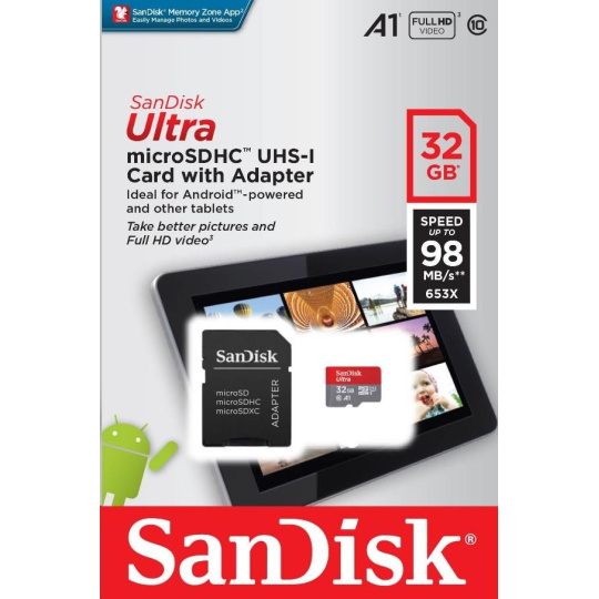 Karta SanDisk MicroSDHC 32 GB Ultra (120 MB/s, A1 Class 10 UHS-I, balenie pre Android - tablet, aplikácia Memory Zone) + adaptér