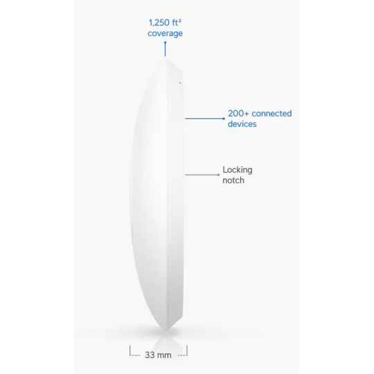 Popis produktu Ubiquiti U7-Lite je cenově nejdostupnější WiFi 7 UniFi AP. Jedná se o dual-band access point s rychlostí přenosu až 4,3Gbps v 5GHz pásmu a až 688 Mbps v pásmu 2,4GHz a pokročilým šifrováním WPA3. U7-Lite je určeno k WiFi pokrytí vaší domácnosti, kanceláře, hotelových prostor nebo skladu. Plná podpora roamingu zajišťuje plynulé předávání připojených klientů mezi jednotlivými AP. Pro připojení do sítě je AP vybaveno 2.5G ETH portem, který slouží i pro napájení pomocí PoE 802.3af nebo pasivním PoE v rozsahu 42,5-57V DC, PoE injektor není součástí balení. Výhody UniFi řešení • Roaming - přechod mezi jednotlivými AP bez výpadků • Wireless uplink – ideální pro místa, kam nelze přivést datový kabel • Až 8 SSID • Detailní statistiky provozu • Guest síť • Load balancing - udržování rovnoměné zátěže / přepínání klientů • Omezování rychlosti pro každé SSID Obsah balení • Zařízení • Kit k přichycení na strop • Sada šroubků  Technické parametry Bezdrátové vlastnosti Bezdrátové frekvence:2.4 + 5 GHz (dual band) WiFi standardy:802.11n, 802.11a, 802.11ac, 802.11b/g, 802.11ax, 802.11be MU-MIMO:Ano Přenosová rychlost - 5GHz [Mb/s]:4300 Přenosová rychlost - 2.4GHz [Mb/s]:688 Vysílací výkon 2.4GHz [dBm]:23 Vysílací výkon 5GHz [dBm]:24 Šifrování:WPA, WPA2, WPA3 2.4GHz MIMO:2 x 2 5GHz MIMO:2 x 2 Typ antény:Vestavěná Roaming:Ano Zisk antény [dBi]:4, 5 Konektory a rozhraní Rychlost LAN:(1) 100/1000/2500Mbps Gigabit LAN:Ano Napájení Napájení přes PoE:802.3af, 42 .. 57V DC Typy PoE:PoE-In (pouze) Max. spotřeba energie [W]:13 Fyzické charakteristiky Použití:Vnitřní Tlačítka:Reset Provozní teplota [°C]:-30 až 40 Hmotnost [g]:313 Šířka [mm]:172 Výška [mm]:172 Hloubka [mm]:33 Software Operační mód:Access Point.