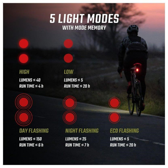 5 svetelných režimov: High (40 lm), Low (5 lm), Day Flashing (150 lm), Night Flashing (25 lm), Eco Flashing (5 lm)