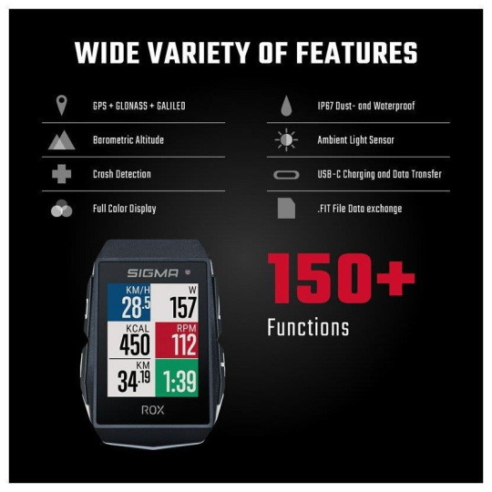 Nezáleží na tom, či sú pre vás dôležité super výkony alebo len udržiavať fyzičku či zdieľať svoje aktivity s priateľmi a rodinou. ROX 11.1 EVO s viac ako 150 funkciami sa stáva používateľovi tréningovým parťákom pre tréningy vonku aj na trenažéri. Okrem početných tréningových funkcií ponúka aj navigáciu, štruktúrované workouty a pripojenie k externým sensorom. Môžete sa tak úplne sústrediť na svoj výkon, ostatok za vás zariadi ROX 11.1 EVO. Vďaka funkcii LIVE SCREEN môžete svoje údaje kedykoľvek sledovať a analyzovať pomocou aplikácie SIGMA RIDE. S navigáciou GPS a mnohými ďalšími funkciami posunie váš tréning na najvyššiu možnú úroveň. Prvotriedna integrovaná funkcia pre vašu bezpečnosť CRASH ALERT odošle správu vašim núdzovým kontaktom v prípade pádu. Chytré oznámenia Smart Notifications počas jazdy informujú o prichádzajúcich hovoroch a SMS.