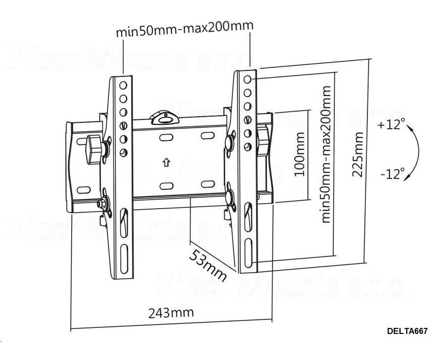 Sklopný držiak TV Fiber Mounts DELTA667 Kvalitný nakloniteľný držiak na televízory s uhlopriečkou 23" až 42" Televízny držiak s náklonom veľmi pevnej a odolnej konštrukcie. Jednoduché naklonenie obrazovky do požadovaného uhla a zabezpečenie v pozícii. Zabezpečenie proti vysadeniu obrazovky z držiaka. Výborná kvalita za skvelú cenu. Držiak TV sklopný, odsadenie 53mm, náklon +12° až -12°, VESA štandard 75x75 až 200x200, nosnosť 30kg - Fiber Mounts DELTA667 Technické údaje: nosnosť 30kg podpora VESA štandardu 75x75 až 200x200 odporúčame na televízory a monitory s uhlopriečkou 23" až 42" vzdialenosť od steny 53mm náklon +12° až -12° zabezpečenie náklonu v požadovanom uhle zabezpečenie proti vysadeniu TV veľmi pevná a odolná konštrukcia integrovaná vodováha jednoduchá a rýchla montáž súčasťou balenia montážny materiál farba čierna záruka 5 rokov Držiak DELTA667 podporuje VESA štandardy: VESA 50x50 VESA 75x75 VESA 100x100 VESA 200x100 a 100x200 VESA 200x200