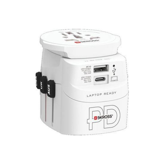 SKROSS PRO Light USB AC45PD – World zabezpečuje jednoduché a bezpečné pripojenie zariadenia vo viac ako 200 krajinách. Podporuje dvojpólové aj trojpólové zásuvky a zvládne napájať výkonné spotrebiče, ako sú notebooky či cestovné fény. Vďaka integrovanému nabíjaču s portmi USB-C a USB-A je možné súčasne nabíjať viac zariadení.