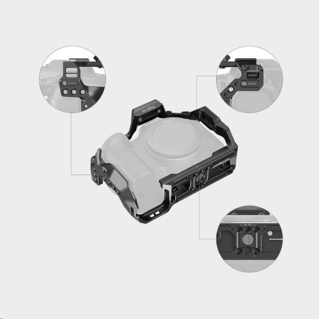 Klietka zachováva prístup k tlačidlám fotoaparátu, sramke karty, displeju a dvierkam batérie a je vybavená niekoľkými úchytmi pre príslušenstvo.