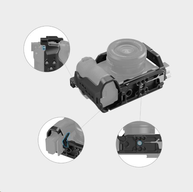 Klec má tiež vyhradené otvory na oboch stranách a v spodnej časti na upevnenie príslušenstva, ako je ručný popruh SmallRig 3848, ramenný popruh 2428 atď.