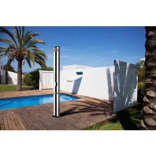 Solárna sprcha je ideálny zdroj teplej vody bez použitia elektriny. Voda je v solárnom zásobníku jednoducho ohrívaná slnkom až na 60°C. K tomu prispieva aj čierne prevedenie sprchy. Sprcha je vybavená miešacou pákovou batériou, aby ste si nastavili teplotu vody, ktorá vám bude vyhovovať.