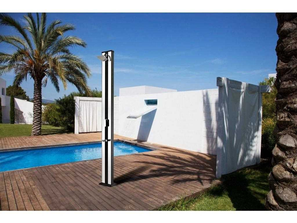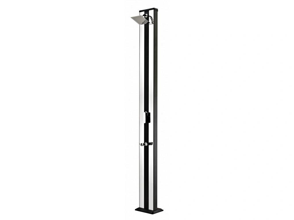 Hliníková solárna sprcha s XXL zásobníkom o objeme 38 l a veľkou sprchovou hlavicou, ktorá zabezpečuje príjemné osvieženie pripomínajúce ľahký letný dážď. Sprcha je vyrobená z hliníka a nerezu, má kovovú pákovú batériu a je vysoká 218 cm. Je vybavená praktickým kohútikom na oplach nôh. Celkovo je sprcha veľmi kvalitne spracovaná a má luxusný vzhľad. Pripojenie na prívod vody je veľmi jednoduché pomocou rýchlospojky na hadicu (súčasť balenia).