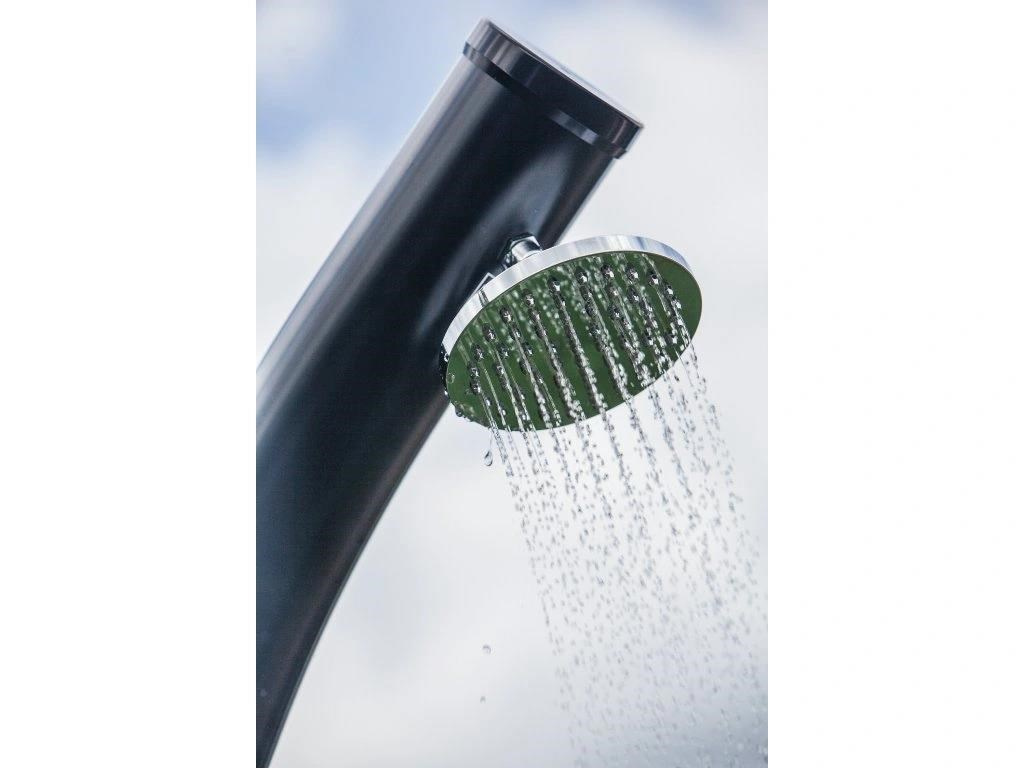 Designová solárna sprcha s veľkou sprchovou hlavicou, ktorá zabezpečuje príjemné sprchovanie pripomínajúce ľahký letný dážď. Elegantne ohnuté telo sprchy, ktoré vkusne zapadne do každej záhrady. Sprcha je vyrobená z kvalitného PVC odolného voči UV žiareniu, má zásobník s objemom 20 l a výšku 215 cm. Pripojenie na prívod vody je veľmi jednoduché pomocou hadicovej rýchlospojky (súčasť balenia). Sprcha je dvojdielna, takže ju možno ľahko zložiť a previesť na iné miesto.