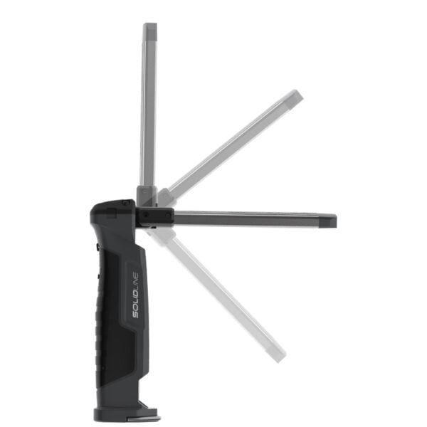 Vďaka hliníkovej hlave lampy je možné ju sklápať aj otočiť o 180°, čo umožňuje spoľahlivé osvetlenie aj v stiesnených pracovných priestoroch. Bočné COB záplavové LED poskytuje biele alebo červené svetlo v piatich rôznych režimoch, zatiaľ čo dodatočná bodová LED zabezpečuje bodové biele svetlo v dvoch úrovniach. Pre optimálne uchopenie je vybavená pogumovanou rúčkou. Integrovaná batéria Solidline SW2R sa jednoducho nabíja pomocou micro-USB.