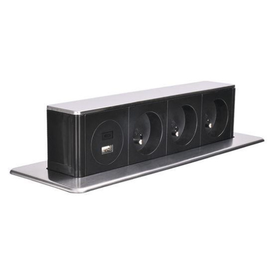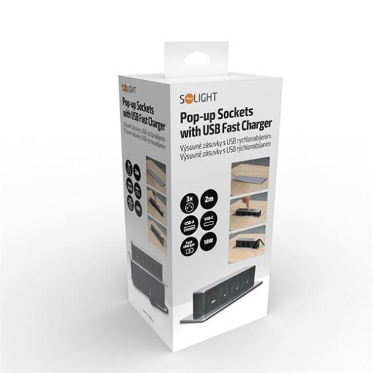 .Solight 3z + USB A+C výsuvný blok zásuvek, 2m, nerez ocel