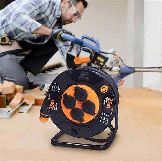 Spoľahlivý pomocník všetkých profesionálov – 25m predlžovací kábel s pevnou konštrukciou navijaku a cievkou z odolného plastu. Vodítko oka zaisťuje plynulé navíjanie kábla a ušetrí tak čas aj nervy. Predĺžený zástrčkový konektor s gumovou protišmykovou rukoväťou uľahčuje manipuláciu aj v rukaviciach. Valec umožňuje zapojiť až štyri elektrické zariadenia a vďaka priemeru vodiča 2,5 mm2 zvládne zaťaženie až 3 680 W (16 A / 230 V~) na dlhú dobu. Kábel s dĺžkou 25 m umožňuje flexibilnú prácu v mnohých odvetviach. Automatické navíjanie bráni brzda na aretáciu. Navijak má stabilnú konštrukciu, zpevnené telo cievky zabezpečuje dlhú životnosť, jednoduchú manipuláciu a spoľahlivosť pri používaní.