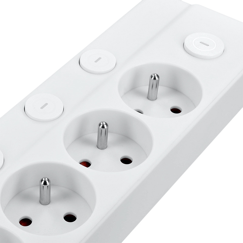 - Prolongačný prívod s samostatnými vypínačmi pre každú zásuvku. Plus centrálny vypínač ovláda všetky zásuvky naraz. Resetovateľný istič pri preťažení zásuvkového poľa prerušuje napájanie. Potom je možné prolongačný prívod opäť uviesť do prevádzky.
