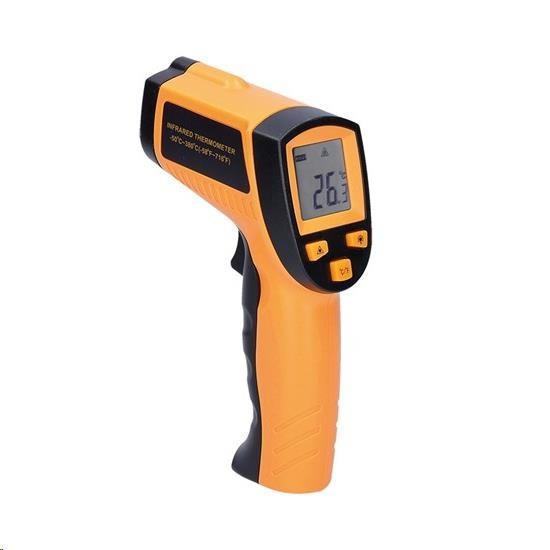 meranie teploty bez nutnosti priameho styku s meraným predmetom rozsah meraných teplôt: -50 + 380°C presnosť merania: +/- 1,5°C zobrazenie teploty s rozlíšením na 0,1°C/°F laserové zameriavanie podsvietený displej prepínanie °C/°F pracovná teplota: 0°C - 50°C optický pomer: 12:1 vlnové spektrum: 8 - 14 µm doba potrebná na meranie: 500 ms automatické vypnutie po 8s bez aktivity pamäť poslednej nameranej hodnoty indikácia vybitej batérie napájanie: 9V batéria (súčasť balenia)