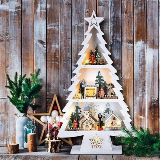 Drevený vianočný stromček s dekoráciami a LED osvietením