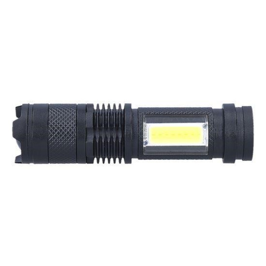 nabíjacia LED kapesná svietidlo s USB konektorom svietivosť: 100lm + 70lm (predné + bočné) 3 režimy svietenia: 100% predné , prerušované (blikajúce) predné, 100% bočné outdoorové použitie (stupeň krytia IP44) nastaviteľný kužeľ svetla (zoom) výdrž batérií min/max: 1hod./2hod. doba nabíjania: 2hod. batéria: 3.7V 400mAh Li-Ion napájanie: USB konektor rozmery: 100 x 26mm farba: čierna balenie: displej box 6ks