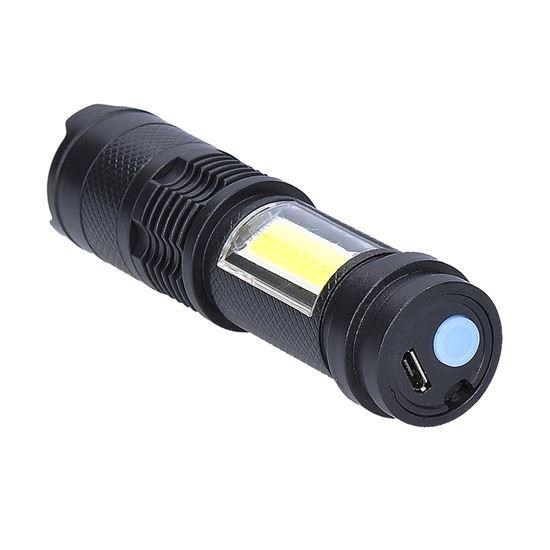 nabíjacia LED kapesná svietidlo s USB konektorom svietivosť: 100lm + 70lm (predné + bočné) 3 režimy svietenia: 100% predné , prerušované (blikajúce) predné, 100% bočné outdoorové použitie (stupeň krytia IP44) nastaviteľný kužeľ svetla (zoom) výdrž batérií min/max: 1hod./2hod. doba nabíjania: 2hod. batéria: 3.7V 400mAh Li-Ion napájanie: USB konektor rozmery: 100 x 26mm farba: čierna balenie: displej box 6ks