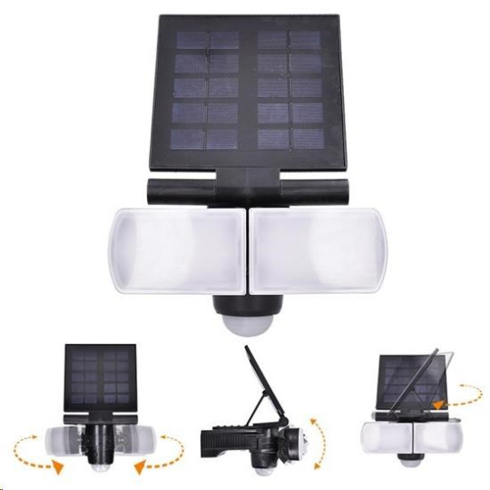 LED osvetlenie so solárnym panelom a nastaviteľným svetelným a pohybovým senzorom svetelné reflektory aj solárny panel možno horizontálne aj vertikálne natáčať a naklápať vhodné na osvetlenie vonkajších častí priestorov bez prívodu elektrickej energie (parkoviská, pergoly, kôlne, záhrady, vstupné brány a pod.) príkon: 8W svetelný tok: 600lm teplota svetla (chromatičnosť): 4000K (neutrálny biely) nastavenie času svietenia: cca 10s-60sek nastavenie svetelnej citlivosti: 10-1000lux uhol detekcie senzora: 110° detekčná vzdialenosť: cca 8m doba nabíjania batérie solárnym panelom: cca 8 hodín (v závislosti od svetelných podmienok) čistá doba svietenia: max. 1hod. batéria: 1x Li-Ion 3,7V 2000mAh vypínač: vypnuté (OFF) / automatické zapnutie (AUTO) farba: čierna