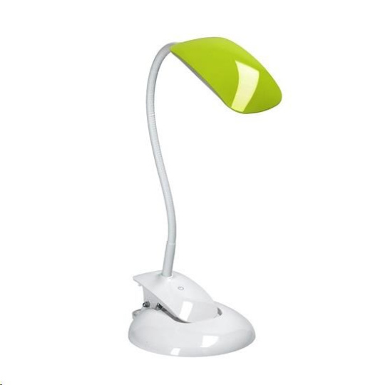 stolná lampička s LED svetelným zdrojom lampička obsahuje pripínací klip aj podstavec pre umiestnenie na stôl tri vymeniteľné farebné kryty súčasťou: biela, čierna, zelená stmievateľná vo troch stupňoch jasu zapínanie a zmena jasu dotykom prsta lampičku je možné ohýbať a natáčať podľa potreby príkon: max. 5W svetelný tok: max. 300lm teplota svetla (chromatičnosti): 4000K (neutrálna biela) farba: biela základňa, meniace sa farebné kryty napájanie: výstup AC 100-240V výstup DC 5V 1A rozmery: cca 380 x 280mm dĺžka napájacieho kábla: 140cm energetická trieda: A+ LED zdroj nie je možné meniť materiál: ABS