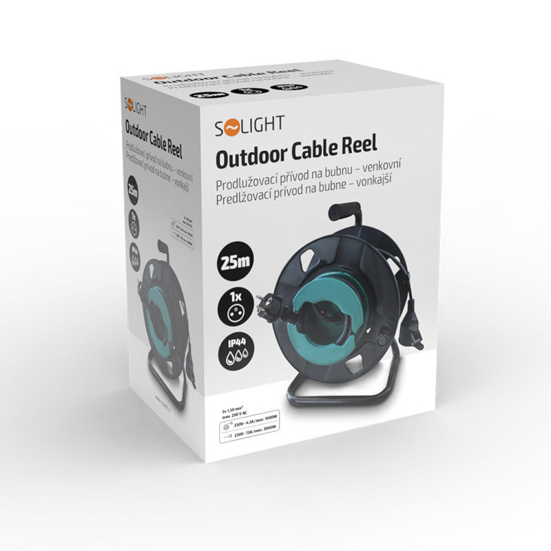 Solight prodlužovací přívod na bubnu, 1 zásuvka, venkovní, 25m gumový kabel, 3x 1,5mm2, IP44