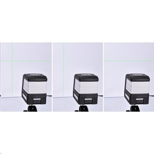 laserová vodováha so zeleným laserom horizontálny a vertikálny lúč samonivelačný režim alebo režim ľubovoľného uhla dosah lúča: až 30m pracovná doba až 8 hodín ochranné puzdro je súčasťou balenia kontrolka indikujúca dosiahnutie vodorovnej hladiny 1/4" statívový závit trieda laseru a vlnová dĺžka: II., 505-550nm presnosť nivelácie: +-3mm/10m maximálny rozsah nivelácie: +-4° stupeň krytia: IP54 pracovná teplota: -10° + 50°C 4x AA batérie (nie sú súčasťou balenia)