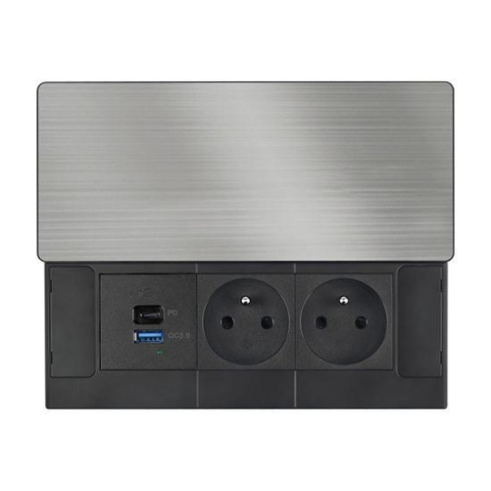 Vrchný kryt z matnej tmavej nerezovej ocele (inox) pôsobí elegantne a prirodzene zapadne do moderného interiéru. Nízky profil, čisté línie a nenápadné posuvné otváranie zachovávajú vzhľad pracovnej plochy. Zásuvky aj nabíjacie porty sú kedykoľvek ľahko prístupné jednoduchým pohybom ruky.