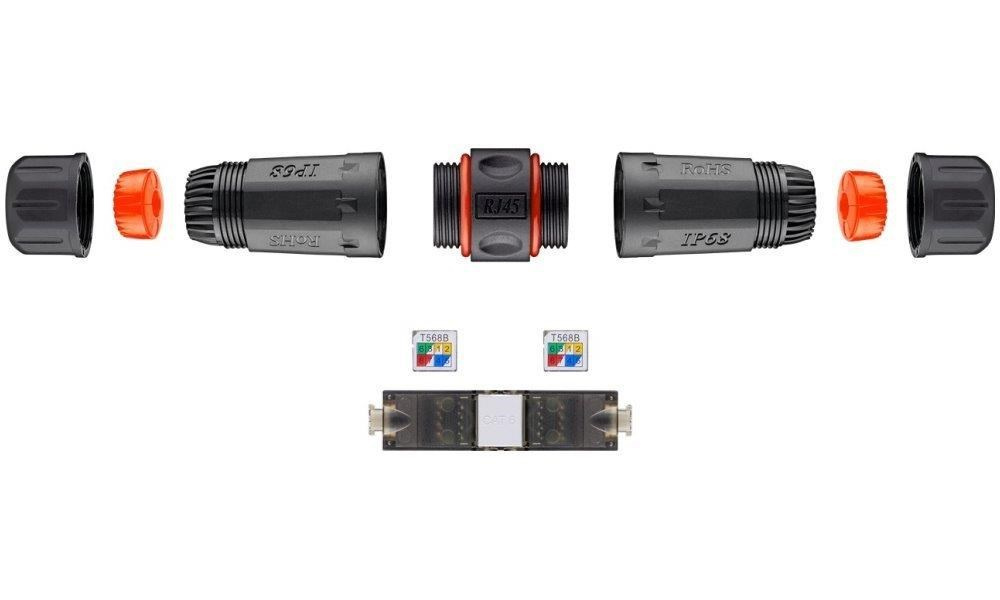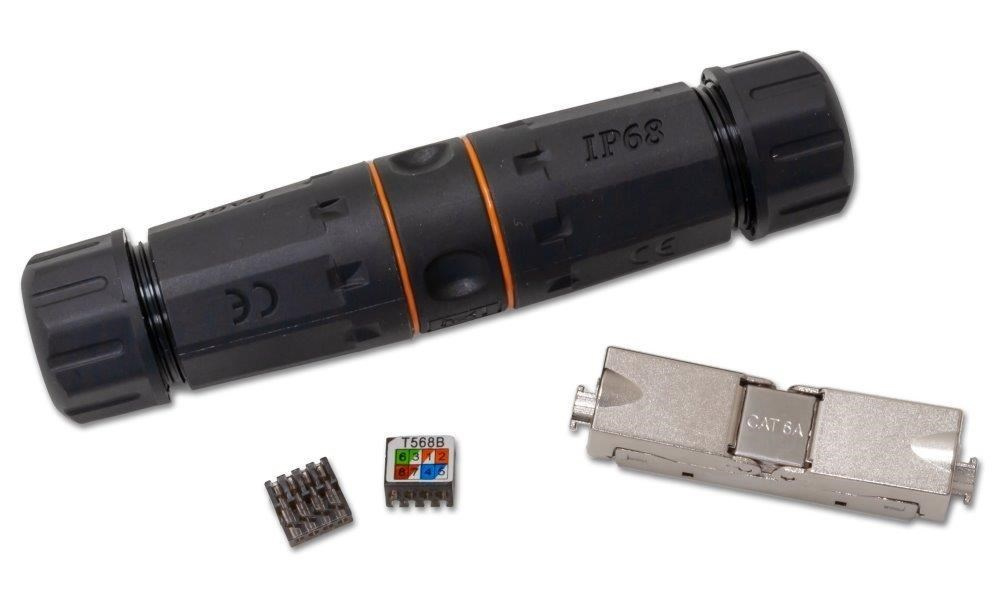 Tienená vodotesná spojka pre rozvod Cat5e/6/6a. Určené na predĺženie segmentov koncovo pripojených káblov. Vhodný nástroj pre vonkajšiu inštaláciu aktívnych vonkajších prvkov a ich jednoduchú montáž a demontáž na ťažko dostupných miestach.