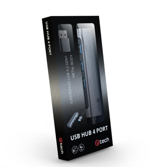 C-tech UHB-U3-AL je kompaktný USB hub s ľahkou a odolnou hliníkovou konštrukciou. Je vybavený 4 portami s rozhraním USB 3.2 Gen1. a maximálnou prenosovou rýchlosťou až 5Gb/s (10× rýchlejší ako USB 2.0). Je ideálnym riešením na rozšírenie dostupných USB portov pre notebooky, ultrabooky a iné zariadenia s obmedzeným počtom USB portov. Veľmi jednoducho tak svoje zariadenie rozšírite o ďalšie periférie, ako sú myši, USB dátové úložiská, externé disky. Hub podporuje technológiu Plug & Play, takže stačí ho pripojiť k zariadeniu a počkať na automatickú inštaláciu predvolených ovládačov bez potreby špeciálnych ovládačov.