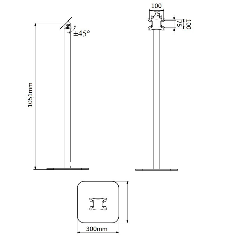 Stojan na monitory Tv EDBAK ITSV01 Podlahový stojan na monitor alebo Tv 15-32", výška 105cm, nastavenie sklonu obrazovky 0-45°, VESA 75x75 a 100x100, nosnosť 8kg Kvalitný veľmi pekný podlahový stojan na monitory alebo televízie s uhlopriečkou 15-32". Stojany sú ideálne pre umiestnenie monitoru do priestoru, kde nie je možnosť alebo nie je vhodné použiť nástenné držiaky. Stojan má fixnú výšku 105cm, obrazovku monitora je možné naklápať v rozmedzí 0° (vodorovne) až 45°. Podporuje VESA štandardy 75x75 a 100x100, je možné použiť nástavce na rozšírenie na 200x100 a 200x200. Odporúčané maximálne zaťaženie 8kg. Stojan na All in One PC, dotykové monitory, klasické LCD, LED, TFT monitory alebo menšie televízory - EDBAK ITSV01 Technické údaje: maximálne zaťaženie 8kg podporuje VESA štandardy 75x75 a 100x100 na obrazovky s uhlopriečkou 15" až 32" naklon obrazovky 0° až 45° výška stojanu 1051mm rozmery podstavca 300x300x10 mm / materiál liatina hmotnosť stojanu 10kg systém skrytého vedenia káblov farebné prevedenie podstavca a držiaku: čierna farebné prevedenie tyče (nosníka): chróm profesionálna kvalita, perfektné spracovanie krásny dizajn záruka 5 rokov Stojan Edbak ITSV01 podporuje VESA štandardy: VESA 75x75 VESA 100x100 možnosť zakúpiť rozšírenie na VESA 200x100 a 100x200 možnosť zakúpiť rozšírenie na VESA 200x200 Najčastejšie použitie stojanu: predajne obchody a obchodné centrá informácie a informačné centrá reštaurácie, prevádzky recepcia, hotely pracoviská k pokladničným systémom výrobné a podnikové haly