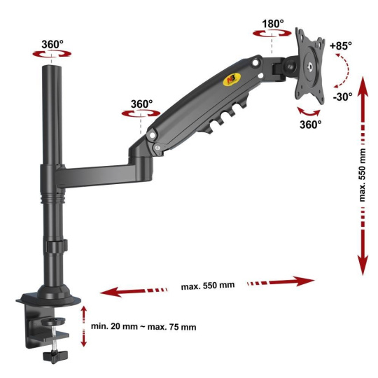 Stolný kancelársky držiak na monitor NB H80B Stolný držiak na monitory 17-27", plne nastaviteľný, TOP kvalita a dizajn, otáčanie do strán, naklápanie, vysúvanie, PIVOT, VESA 75/100, nosnosť 9kg Špičkový stolný držiak s uchytením na okraj alebo do priestoru stola. VESA štandard 75x75 a 100x100 pre uchytenie monitorov s uhlopriečkou 17-27". Držiak umožňuje úplnú nastaviteľnosť polohy monitoru: otáčanie do strán, duálne výškové polohovanie, naklápanie, vzdialenosť od uchytenia a rotáciu monitoru. Rameno držiaka je osadené plynovým piestom s nastaviteľnou tuhosťou 2-9kg, výškové polohovanie je teda extrémne jednoduché a pohodlné. Farebné prevedenie čierne, záruka 3 roky. Stolný držiak monitoru na okraj stola alebo do priestoru stolovej dosky, nosnosť 9kg, VESA 75x75 a 100x100, úplné 3D nastavenie polohy monitora, profesionálna kvalita - NB H80B Technické údaje: zaťaženie: minimálne 2kg, maximálne 9kg na monitory s uhlopriečkou 17" až 27" VESA štandardy 75x75 a 100x100 duálne výškové polohovanie (ramenom s piestom + objímkou na nosníku) nastavenie výšky od stolu 0-550mm otáčanie do strán +360° / -360° sklápanie +85° / -30° rotácia obrazovky - na šírku alebo na výšku dva typy uchytov na stolovú dosku (na okraj stola alebo do priestoru stolovej dosky) uchytenie na stolovú dosku o priemere 20-75mm systém na usporiadanie káblov farebné prevedenie čierne záruka 3 roky Profesionálny stolový držiak na monitor NB H80B Držiak monitora NB H80B podporuje VESA štandardy: VESA 75x75 VESA 100x100 Profesionálna kvalita, krásny dizajn a extrémna nastaviteľnosť - to všetko za cenu strednej triedy stolových držiakov.