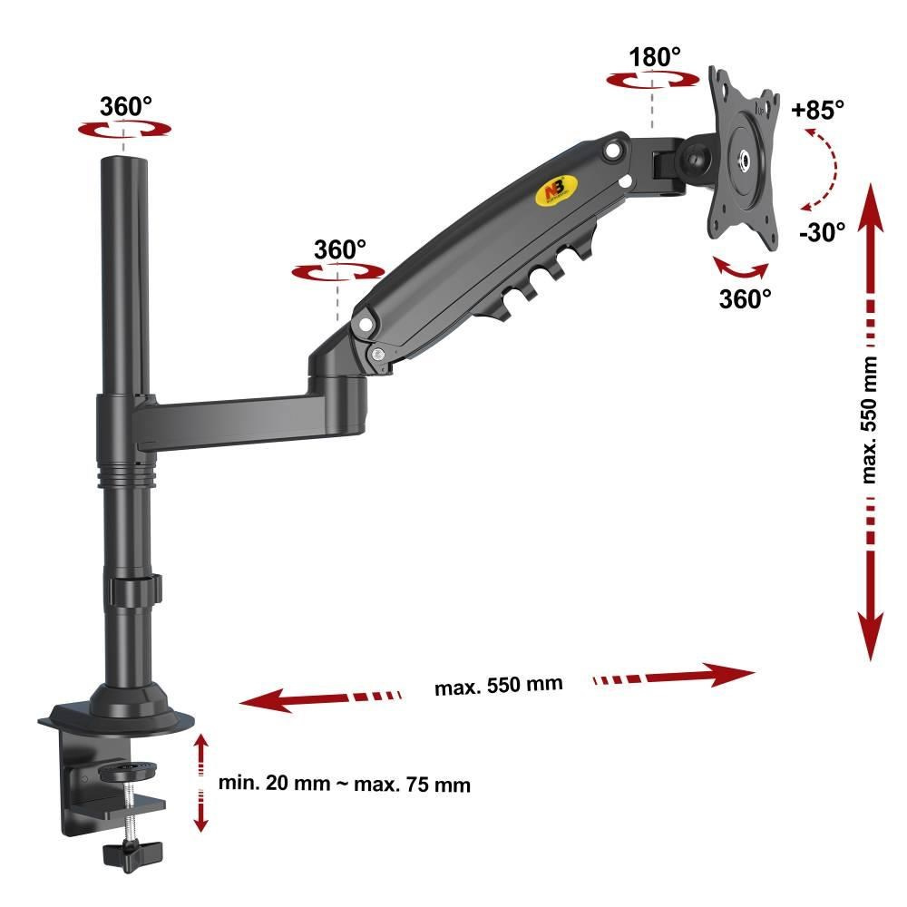 Stolný kancelársky držiak na monitor NB H80B Stolný držiak na monitory 17-27", plne nastaviteľný, TOP kvalita a dizajn, otáčanie do strán, naklápanie, vysúvanie, PIVOT, VESA 75/100, nosnosť 9kg Špičkový stolný držiak s uchytením na okraj alebo do priestoru stola. VESA štandard 75x75 a 100x100 pre uchytenie monitorov s uhlopriečkou 17-27". Držiak umožňuje úplnú nastaviteľnosť polohy monitoru: otáčanie do strán, duálne výškové polohovanie, naklápanie, vzdialenosť od uchytenia a rotáciu monitoru. Rameno držiaka je osadené plynovým piestom s nastaviteľnou tuhosťou 2-9kg, výškové polohovanie je teda extrémne jednoduché a pohodlné. Farebné prevedenie čierne, záruka 3 roky. Stolný držiak monitoru na okraj stola alebo do priestoru stolovej dosky, nosnosť 9kg, VESA 75x75 a 100x100, úplné 3D nastavenie polohy monitora, profesionálna kvalita - NB H80B Technické údaje: zaťaženie: minimálne 2kg, maximálne 9kg na monitory s uhlopriečkou 17" až 27" VESA štandardy 75x75 a 100x100 duálne výškové polohovanie (ramenom s piestom + objímkou na nosníku) nastavenie výšky od stolu 0-550mm otáčanie do strán +360° / -360° sklápanie +85° / -30° rotácia obrazovky - na šírku alebo na výšku dva typy uchytov na stolovú dosku (na okraj stola alebo do priestoru stolovej dosky) uchytenie na stolovú dosku o priemere 20-75mm systém na usporiadanie káblov farebné prevedenie čierne záruka 3 roky Profesionálny stolový držiak na monitor NB H80B Držiak monitora NB H80B podporuje VESA štandardy: VESA 75x75 VESA 100x100 Profesionálna kvalita, krásny dizajn a extrémna nastaviteľnosť - to všetko za cenu strednej triedy stolových držiakov.