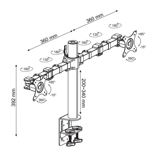 Stolný držiak na 2 monitory Ergosolid NF12 Stolový držiak na 2 monitory 10-30", otáčateľný +/- 180°, sklopný +85°/-15°, pivot, nastavenie výšky 20-34cm, dĺžka ramien 36cm, VESA 75x75 a 100x100, spoľahlivý stolový úchyt 20-100mm, nosnosť 20kg Stolový držiak pre spoľahlivé zavesenie dvoch monitorov a ich nezávislé nastavenie. Držiak vyniká svojou kvalitou, spoľahlivosťou a jednoduchým polohovaním zavesených monitorov. Veľmi jednoducho nastavíte výšku monitorov (bez použitia náradia), náklon, otáčanie do strán, rotáciu obrazoviek (otočenie na šírku alebo na výšku), korekciu roviny obrazovky. Nosník držiaku je prispôsobený na vedenie káblov, vývod je nad stolovou doskou. Upevnenie držiaku je možné na okraje všetkých stolových dosiek o priemere 20mm až 100mm. Držiak je vhodný na zavesenie monitorov s uhlopriečkou 10" až 30" s hmotnosťou až 10kg (celková nosnosť 20kg). Farebné prevedenie čierne. Záruka 3 roky. Stolový držiak na 2 monitory Ergosolid NF12 Technické údaje: celková nosnosť 20kg na monitory s uhlopriečkou 10" až 30" podpora VESA štandardov 75x75 a 100x100 nastaviteľná výška 200-340mm nezávislé nastavenie každého monitoru otočenie do strán +/- 180° sklon +85° až -15° funkcia PIVOT - otočenie monitoru na šírku alebo na výšku nastavenie vzdialenosti monitora od úchytu dĺžka ramien 360mm 3 spoľahlivé kĺby pre nastavenie požadovanej pozície každého ramena materiál oceľ uchytenie na okraj všetkých stolových dosiek o priemere 20mm až 100mm farebné prevedenie čierne balenie obsahuje inštalačný materiál záruka 3 roky Kvalitný stolový držiak na upevnenie a polohovanie 2 monitorov Ergosolid NF12 Držiak podporuje VESA štandardy pre upevnenie monitorov: VESA 75x75 VESA 100x100 Stolový držiak na 2 monitory ERGOsolid NF12 je vhodný na zavesenie všetkých dostupných značiek monitorov. Držiak je vhodný na monitory Acer, AOC, Asus, BenQ, Dell, Eizo, Fujitsu, Hanspree, HP, iiyama, Lenovo, LG, Marshall, MSI, NEC, Neovo, Panasonic, Philips, Samsung, Sharp, ViewSonic, All in One PC a ďalšie. Vďaka vynikajúcej kvalite, odolnosti a spoľahlivosti sa tieto držiaky osvedčili na použitie aj v náročných prevádzkach: školské učebne, knižnice, nemocnice, prevádzky a výrobné haly vo firmách.