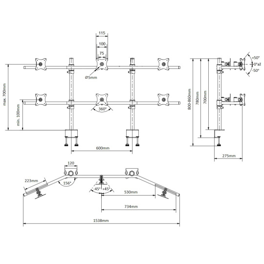 Stolný držiak na 6 monitorov Edbak SV17 Stolný držiak na 6 monitorov alebo televízorov s uhlopriečkou 17"-27", parabola, plne nastaviteľné polohy monitorov, profesionálna kvalita, VESA štandardy 75x75 a 100x100, farba čierna, nosnosť 60kg Profesionálny parabolický stolný držiak na 6 monitorov 17-27". Nastaviteľná poloha každého monitora podľa potreby: otáčanie do strán, naklápanie, korekcia roviny, pivot, posun do strán. Nastavenie potrebnej výšky vodorovných nosníkov s monitormi. V balení nájdete 2 typy stolových úchytov: svorky na uchytenie na okraje stolov alebo šroubovicu na uchytenie do prechodiek. Systém vedenia káblov. Najvyššia kvalita, silnostenný materiál. Podpora VESA štandardov 75x75 a 100x100, farebné prevedenie čierne, nosnosť 60kg. Záruka 10 rokov. Profesionálny stolný držiak na 6 monitorov v parabole Edbak SV17 Technické údaje: nosnosť 60kg na monitory s uhlopriečkou 17" až 27" VESA štandardy 75x75mm a 100x100mm polohovanie vzdialenosti monitorov medzi sebou 223mm nastavenie sklonu +/- 50° otáčanie monitora do strán +/-45° funkcia pivot uchytenie na stolové dosky o hrúbke 10-55mm (prechodka) alebo 10-80mm na okraj stola najvyššia kvalita, silnostenný materiál, profesionálny výrobok veľmi jednoduchá a rýchla montáž farba čierna záruka 10 rokov Držiak na 6 monitorov displejov Edbak SV17 Stojan na 6 monitorov Edbak SV17 podporuje VESA štandardy: VESA 75x75 VESA 100x100 možnosť zakúpenia rozšírenia na VESA 200x100 a 100x200 možnosť zakúpenia rozšírenia na VESA 200x200
