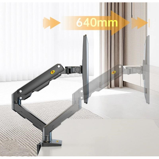 Držiak na monitor TV NB G50 Profesionálny stolový držiak na širokouhlý monitor alebo All in One PC 27-45", otočný +/-180°, sklopný +60°/-15°, nastaviteľná výška od stola 190-475mm, nastaviteľná vzdialenosť 0-640mm, 1x port USB, 2 typy stolových úchytov, systém vedenia káblov, VESA štandardy 75x75 a 100x100, nosnosť 16kg Jeden z najkvalitnejších stolových držiakov na zaveste širokouhlých monitorov alebo All in One PC - profesionálny, kvalitná konštrukcia, dizajn dôsledne spracovaný do detailu a veľmi jednoduché polohovanie. Držiak odporúčame aj náročným zákazníkom, do vytížených prevádzok, kancelárií alebo showroomov. Svoje uplatnenie nájde na každom stole. Držiak je ideálny na širokouhlé aj klasické monitory, All in One PC alebo televízory s uhlopriečkou 27-45", u širokouhlých monitorov môže byť uhlopriečka aj väčšia. Podmienkou je hmotnosť v rozmedzí 5-16kg, pri ľahších obrazovkách nebude možné výškové polohovanie. Držiak podporuje VESA 75x75 a 100x100, v prípade potreby ponúkame aj rozšírenie na 200x100, 100x200 a 200x200. Kompletná polohovateľnosť: otáčanie +/-180°, naklápanie +60°/-15°, jednoduché nastavenie výšky vďaka plynovému piestu od 195mm až do 475mm, nastavenie vzdialenosti od úchytu 0-640mm, funkcia pivot, port USB, dôsledné vedenie káblov, 2 typy stolových úchytov. Profesionálny stolový držiak na širokouhlé monitory a All in One PC NB G50 Technické údaje: minimálna hmotnosť monitoru alebo TV 5kg maximálna hmotnosť monitoru alebo TV 16kg podporuje VESA štandardy 75x75 a 100x100 odporúčaná uhlopriečka monitoru TV 27" až 45" ideálny na širokouhlé monitory, zobrazovacie zariadenia, All in One PC alebo televízory otáčanie do strán +/- 180° naklápanie +60° / -15° nastavenie výšky od stolovej dosky 195mm až 475mm výškové polohovanie 280mm nastavenie vzdialenosti od stolného uchytenia 0-640mm funkcia pivot - horizontálne alebo vertikálne otáčanie obrazovky 1x port USB na základni držiaka systém vedenia káblov 2 typy stolových úchytov (na okraj alebo cez otvor do priestoru) farebné prevedenie čierne záruka 5 rokov Profesionálny stolový držiak na širokouhlý monitor NB G50 Stolový držiak na širokouhlé monitory TV NB G50 podporuje VESA štandardy: VESA 75x75 VESA 100x100