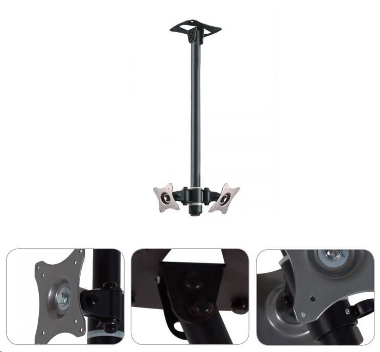 Stropný držiak TV monitoru EDBAK SV32 Profesionálny stropný držiak na zavesenie 2 televízorov alebo monitorov 17-37" za sebou, výškové nastavovanie, otáčanie, náklon, funkcia PIVOT Stropný držiak najvyššej kvality na zavesenie 2 obrazoviek s uhlopriečkou 17-37". Držiak umožňuje kompletnú nastaviteľnosť - reguláciu výšky, otáčanie jednotlivých obrazoviek na stranách, náklon a rotáciu - funkcia PIVOT. Konštrukcia je oceľová, hrubostenná. Držiak podporuje VESA štandardy 75x75 a 100x100, je možné zakúpiť rozšírenie na 200x100 a 200x200. Kabeláž je možné viesť vo vnútri držiaku. Vybrať si môžete vo 2 farebných variantoch - čierne a strieborné. Záruka 10 rokov. Stropný držiak na nezávislé zavesenie 2 obrazoviek chrbtom k sebe - Edbak SV32 Technické údaje: maximálne zaťaženie 20kg odporúčaná uhlopriečka TV alebo monitoru 17" až 37" podporuje VESA štandardy 75x75 a 100x100 za príplatok možnosť rozšírenia VESA štandardu na 200x100 alebo 200x200 dĺžka držiaku 730mm nastavenie vzdialenosti od stropu nezávislé otáčanie obrazoviek na obe strany +/- 90° náklon obrazovky nahor alebo nadol +/- 60° funkcia PIVOT - horizontálne alebo vertikálne natočenie obrazovky profesionálny stropný držiak na 2 obrazovky materiál oceľ farebné prevedenie čierne alebo strieborné záruka 10 rokov Držiak podporuje VESA štandardy: VESA 75x75 VESA 100x100 VESA 200x100 - za príplatok VESA 200x200 - za príplatok